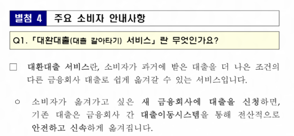 - 기존 채무통합처럼 묶어서는 불가하고 대출 건별로 갈아타야 합니다.